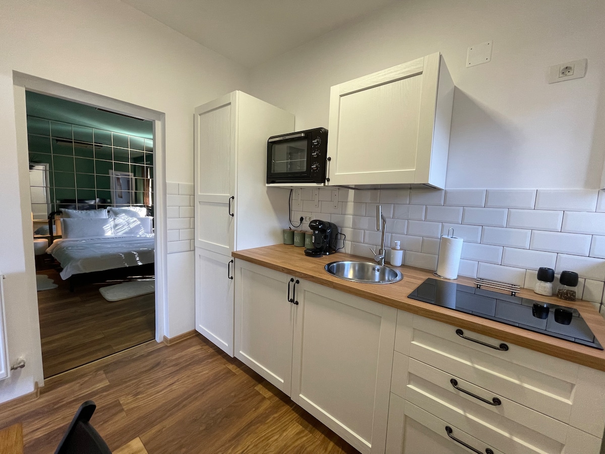 Studio lumineux et spacieux situé dans un immeuble de 10 étages, récemment rénové avec une cuisine moderne entièrement équipée avec une plaque de cuisson électrique, un réfrigérateur intégré et tous les autres ustensiles de cuisine nécessaires pour préparer un repas gastronomique. Il est situé dans un quartier calme, à moins de 15 minutes du centre-ville, avec des transports en commun directs vers la vieille ville, à proximité d'une grande variété de beaux parcs et lacs tels que Tei, Plumbuita, Circului. Parking gratuit disponible.
