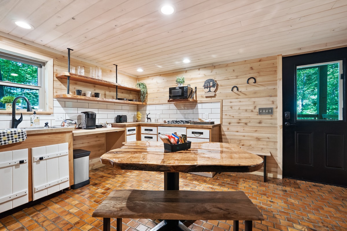 Laissez l'agitation derrière vous pour le murmure des chênes et l'étreinte apaisante de notre chalet rénové de Laurel Highlands. Profitez d'un barbecue sur la terrasse, asseyez-vous autour du feu, observez la faune dans les bois ou renouez avec vos amis et votre famille à l'intérieur du chalet confortable. Enveloppé par de grands chênes, le chalet est calme et semble isolé. Pourtant, il se trouve à seulement quelques minutes d'Ohiopyle, Seven Springs, Fallingwater et d'autres attractions populaires des Laurel Highlands.