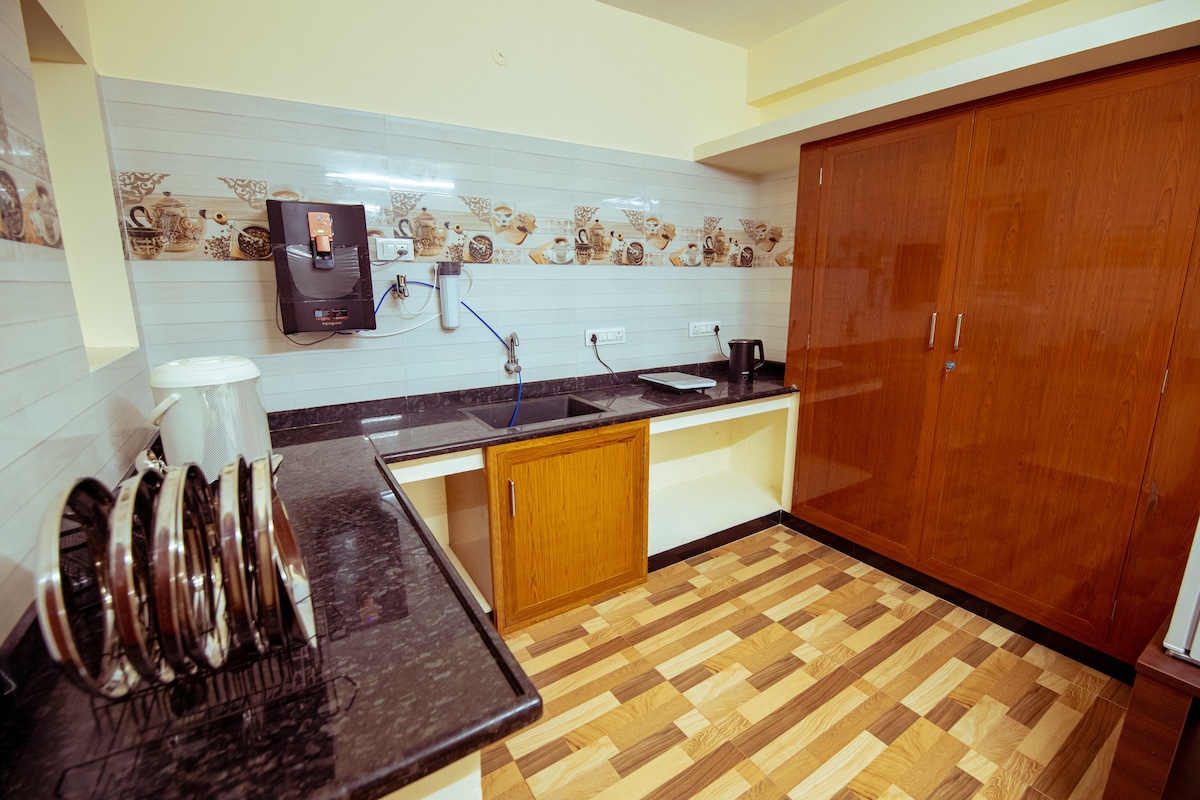 Séjournez dans notre appartement confortable au cœur de Srirangam, à quelques pas du temple Sri Ranganathaswamy. Parfait pour les voyageurs spirituels et les touristes, il offre une ambiance paisible, un 2BHK confortable avec 3 salles de bains, une kitchenette et une connexion WiFi haut débit. Accédez facilement au temple de Jambukeshwarar, à Rockfort et au barrage de Kallanai. Proche des restaurants et des transports locaux. Profitez d'un séjour calme et bien ventilé avec tous les éléments essentiels. Veuillez noter que nous n'acceptons que les couples mariés ou la famille pendant leur séjour.