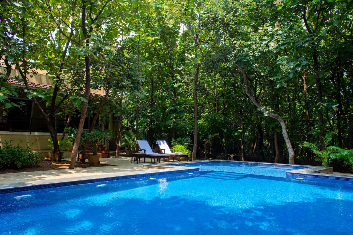 Reconnect with nature at this unforgettable escape. Best for visiting Tadoba, family events, or a leisure stay. Amenities: Pool, Rain dance, Well, Pets, Pool table, table tennis, carrom, chess, foosball. chargeable sports nearby: pickleball, cricket/football turf, badminton, tennis, basketball. Close to Balaji temple, riverfront view, and a countryside experience. Rejuvinate your connect to the nature.