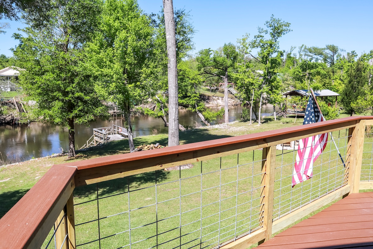 No cleaning fees! Our one & only peaceful, quiet golf cart friendly location conveniently between I-10/US90 yet the Caverns, Bear Paw river float, Merritts Mill Pond, Hinson Nature Preserve, Blue Springs and all shops, cinema, boat launches & restaurants within a 10 min drive. Golfing, beach, & airports within 1 hour. Modern cottage on a private 1/2 acre equipped with large smart TV's in both the living room and bedroom with Prime video.
