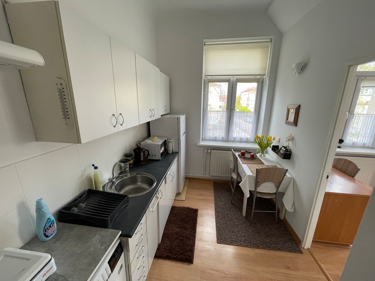 Cet endroit unique a un style qui lui est propre ! Fini à un niveau élevé. L'appartement est situé au 3e étage dans un confortable immeuble de trois étages. L'appartement est entièrement équipé avec des articles de tous les jours, une connexion Internet haut débit. Le quartier est calme et paisible, et l'aire de jeux devant le pâté de maisons donne aux enfants un endroit où jouer sans soucis. À quelques mètres de l'appartement se trouve un arrêt d'autobus et une gare ferroviaire. Il y a aussi des commerces de proximité, des restaurants, un coiffeur, une pharmacie et un marché dans la région.