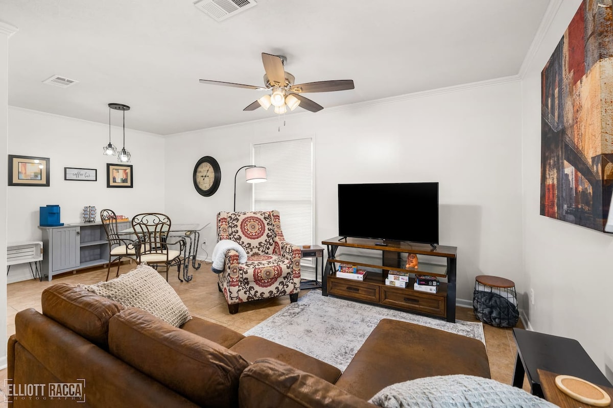 Profitez d'une expérience élégante dans ce logement central. Parfaitement configuré pour les séjours prolongés et le travail à distance. Profitez de tout le confort de la maison, avec un rapport qualité-prix fantastique pour les réservations d'un mois ou plus Profitez de l'appartement spacieux d'une seule pièce avec un lit King confortable et de l'espace pour vous détendre. Parking réservé juste devant votre porte, et un lave-linge et un sèche-linge sont dans l'appartement. Cet endroit spécial est proche de tout et a tout ce dont vous avez besoin pour un court ou long séjour, ce qui facilite la planification de votre voyage !