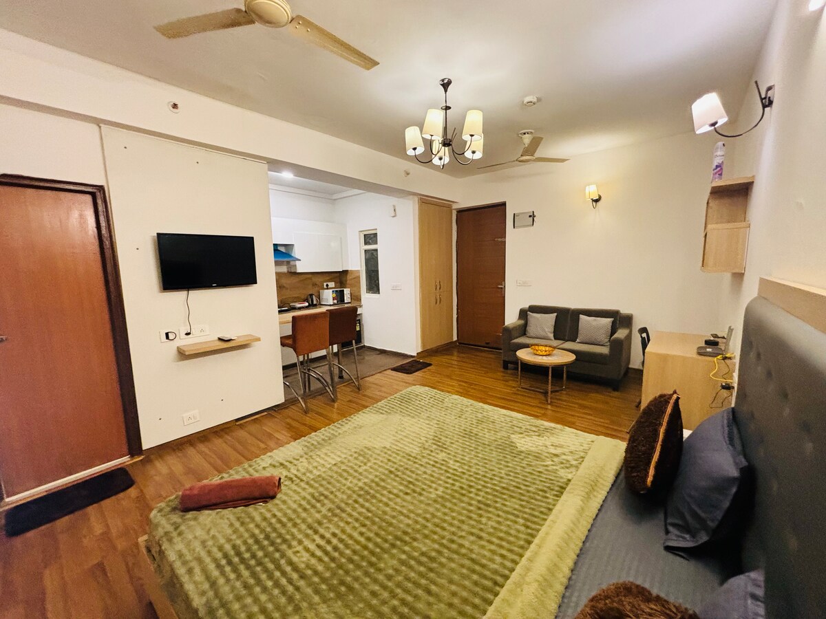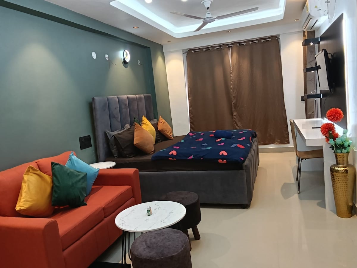 Good Monthly stay discounts available. Kick back and relax in our elegant & fully furnished studio. The earthy interiors will calm you like a boutique hotel experience. A combined charm of English design elements and luxury that offers comfort and style in every corner. We've designed this space with the same care and attention to detail as we were to live here ourselves, prioritizing comfort, style, and authenticity. Top floor | Fast WIFI | Private Balcony | Heart of Noida