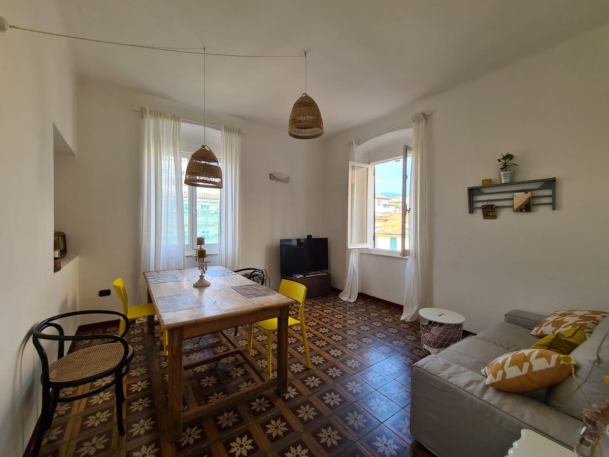 Bel appartement de style marin, au deuxième étage (sans ascenseur) à quelques minutes à pied du centre historique et du front de mer de Chiavari. Un grand salon - Wi-Fi gratuit, smart tv et Netflix - cuisine complète avec appareils électroménagers, coin petit déjeuner avec machine à café - même à l'américaine - bouilloire, grille-pain et micro-ondes. Une chambre double, une salle de bain avec toilettes et douche. Draps et serviettes de bains inclus. Un parking privé gratuit
