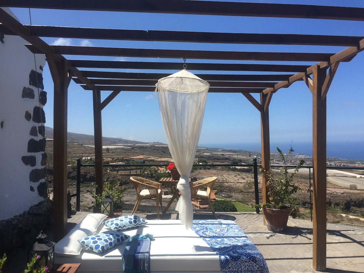 @sleephousetenerife Belle maison de style canarien avec deux chambres récemment rénovées, une grande terrasse et une piscine avec solarium et espace détente. La maison est située dans un quartier calme avec une atmosphère rurale mais avec l'avantage d'être à seulement 15 minutes de la plage. La maison est au sommet d'une colline et offre une vue panoramique merveilleuse et propre sur la mer. Les couchers de soleil sont magnifiques avec l'île de La Gomera en arrière-plan.