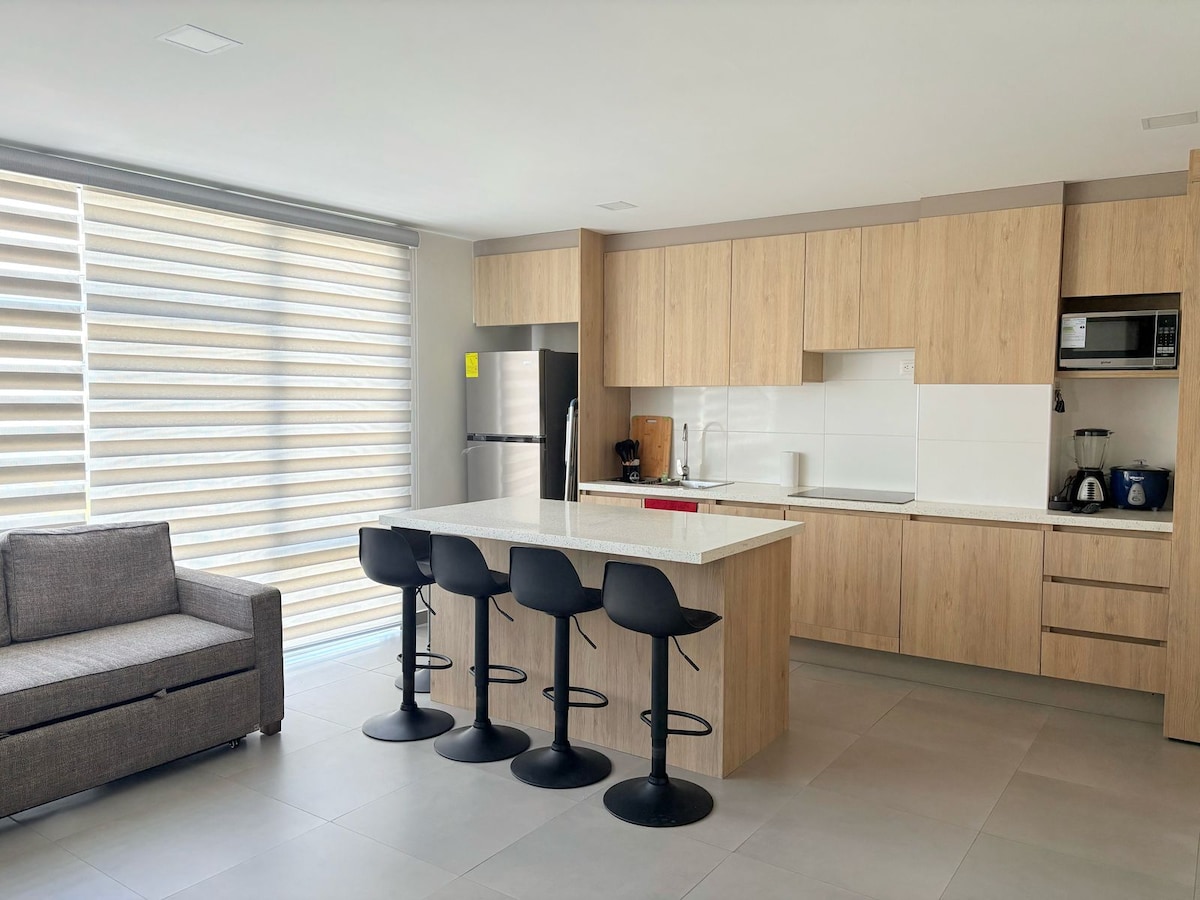 Faites une pause et détendez-vous dans cet appartement calme. Suite 3C Sunrise, idéale pour les couples ou les petites familles (2 à 4 personnes). Située à quelques pas de la plage de Chipipe, elle allie confort et style avec une chambre principale, deux salles de bains complètes, un salon avec canapé-lit, une cuisine équipée, des téléviseurs intelligents, le WiFi haut débit et une serrure numérique. Un espace moderne, fonctionnel et parfait pour profiter de Salinas en tout confort.