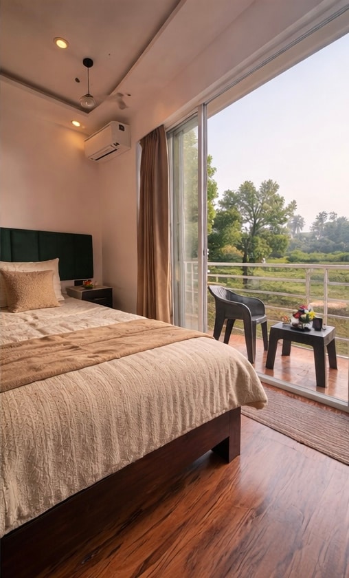 Nirja est une villa en A conçue avec soin avec un lit King, un lit Queen loft accessible par un escalier en bois et d'élégantes salles de bains privatives. Montez sur votre terrasse privée avec une vue sereine sur les terres agricoles luxuriantes, ou détendez-vous dans la baignoire en plein air attachée à la salle de bain - un espace apaisant et luxueux pour se détendre et se reconnecter. Entourée de chants d'oiseaux et de paons, Nirja offre une escapade tranquille dans le calme de la nature.