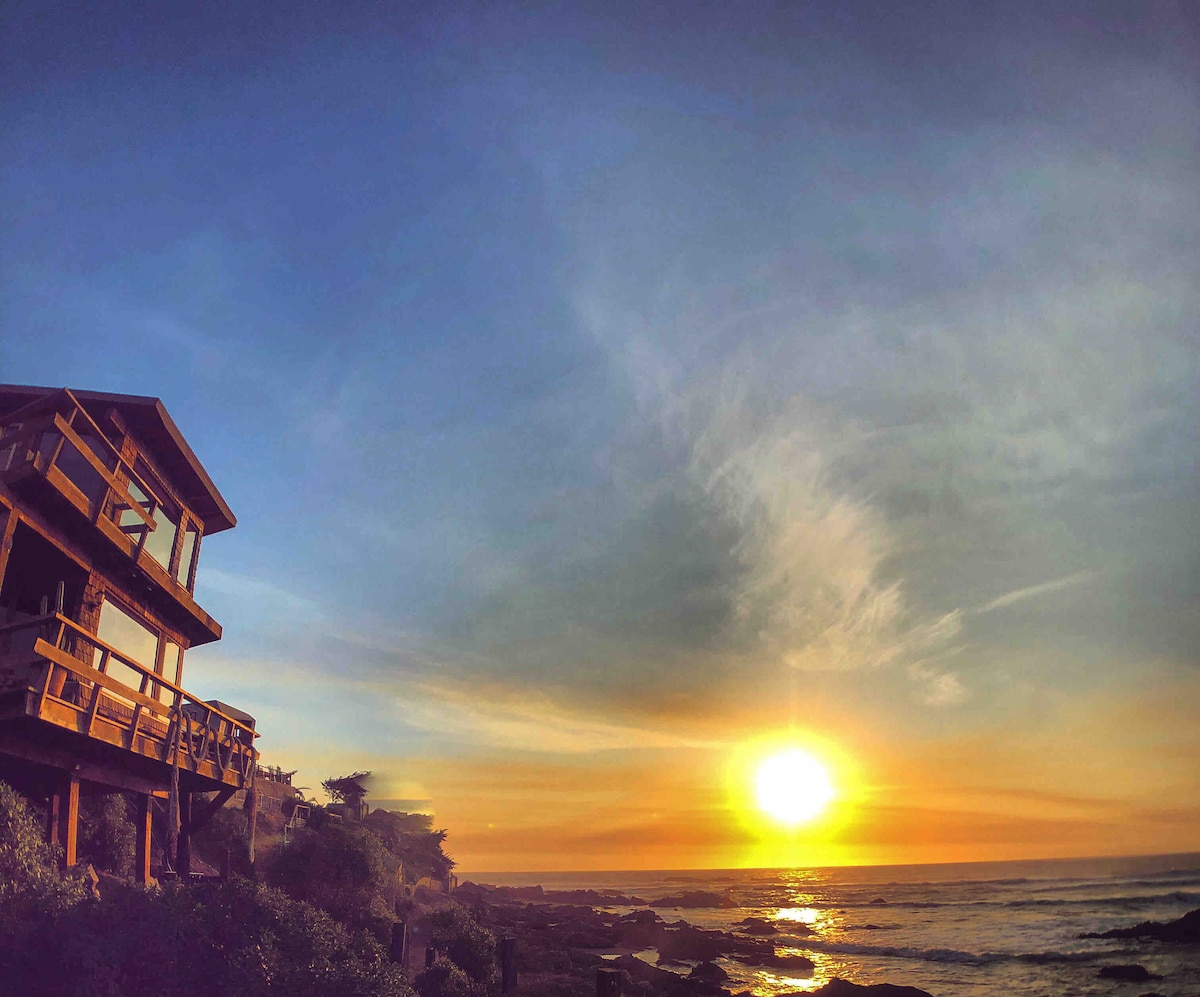 Belle cabane pour 2 personnes dans un emplacement privilégié, à 2 min. à pied de la plage de Punta de Lobos, située sur un terrain avec une petite forêt et un parking privé. La cabane dispose de deux terrasses, l'une avec « sundeck » et vue sur la mer et les vagues, l'autre terrasse est couverte, protégeant de la garuga nocturne. Nous acceptons jusqu'à 2 chiens. Le chalet n'est pas disponible pour une location à long terme.