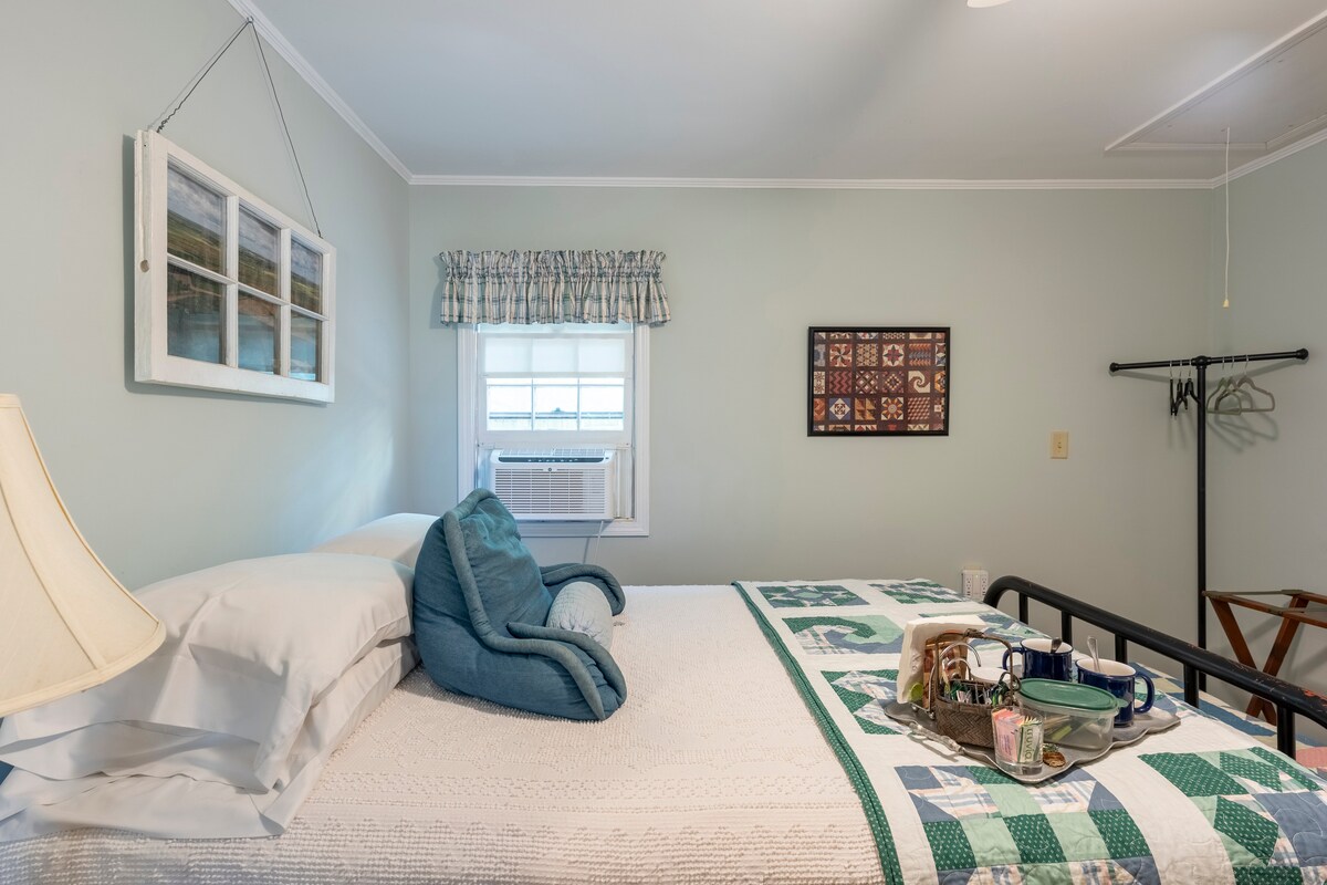 Charmant chalet, confortable et indépendant avec des courtepointes faites à la main sur un lit queen. Salle d'eau privée avec douche. Micro-ondes, petit réfrigérateur et cafetière. Ventilateur de plafond, climatisation de fenêtre et chauffage électrique sur pied. Calme et paisible. Parking gratuit à l'intérieur de la cour clôturée.