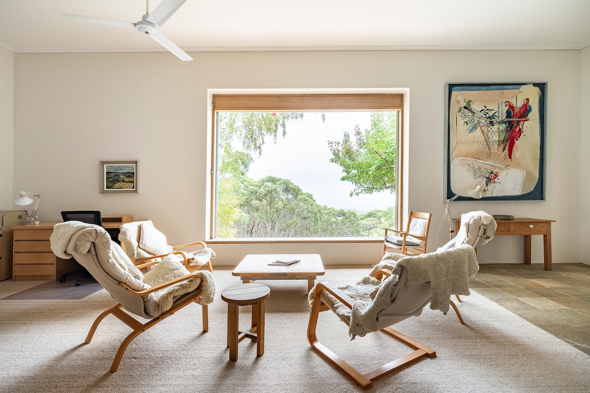 Appleton House, 20 mins from Adelaide, offers beauty, privacy and seclusion. Overlooking bushland, the city of Adelaide and sea, this unique retreat features: light spaces; galley kitchen; 2.5-seater sofa, 65” OLED SmartTV; slow combustion wood heater offering ambience & warmth on the coldest winter nights; native birds & resident kangaroos. Access a myriad of walking trails, restaurants and fine-dining excellence, cafes, bakeries, supermarkets, shops and more close by.