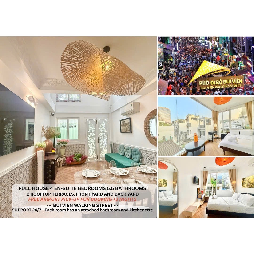 Wellcome to BRAND-NEW house charmingly designed in Indochina style located in the high frequency of BUI VIEN walking street in D1, artistic style, resort facilities, spacious air-conditioned living room WHERE YOU CAN HANG AROUND UPTO 10 PERSONS in 2 large sofas and chairs. Windows, balconies and rooftop terraces have a panoramic view of the whole city. A unique, luxurious house in BUI VIEN walking street but nested in a short alley so there is no noise for caressing your peaceful sleep.