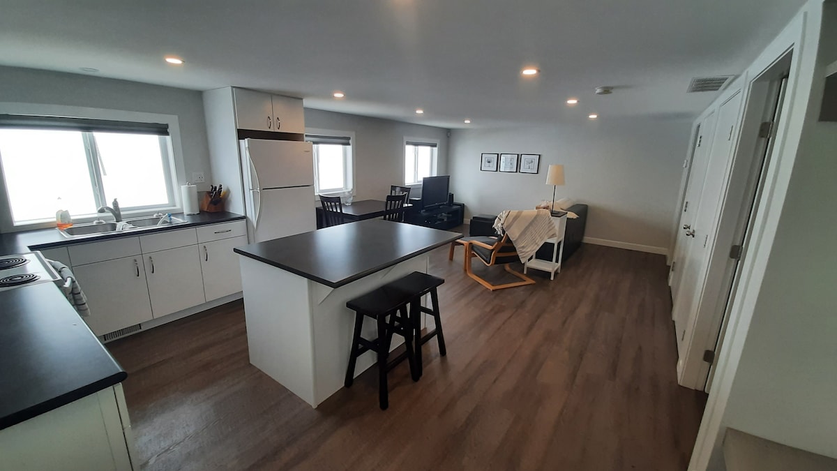 Suite moderne au sous-sol avec lumière du jour et grande cuisine entièrement équipée. Climatisation pour l'été, chauffage pour l'hiver avec cheminée électrique, et chauffages supplémentaires dans chaque chambre pour vous assurer que vous êtes toujours à l'aise. Espace bien éclairé avec des stores cellulaires. Port USB sur chaque lampe pour plus de commodité. Internet rapide 100 mbps et télévision intelligente avec accès câblé ou services de streaming. La cuisine est équipée d'appareils électroménagers de grande taille, d'un système de filtration d'eau et d'une machine à glaçons dans le réfrigérateur.