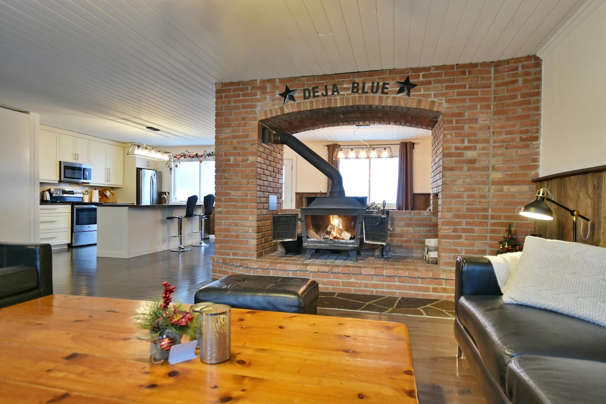 Un vrai bijou ! Chaleureux et accueillant, notre chalet de 3 chambres peut accueillir confortablement 8 personnes et offre un cadre haut de gamme pour votre escapade spéciale à Blue Mountain. Décoré avec un mélange de vintage et de moderne pour offrir le meilleur confort, nous offrons un jacuzzi pour 6 personnes sur notre terrasse supérieure orientée plein sud, une cuisine gastronomique, une salle de bain spa, 3 téléviseurs intelligents, une connexion Wi-Fi, une buanderie, un barbecue au propane et bien plus encore. Venez en famille, entre amis ou juste à deux, pour vous détendre et vous reposer. À la campagne, mais à 2 minutes de la ville. Vous allez adorer !