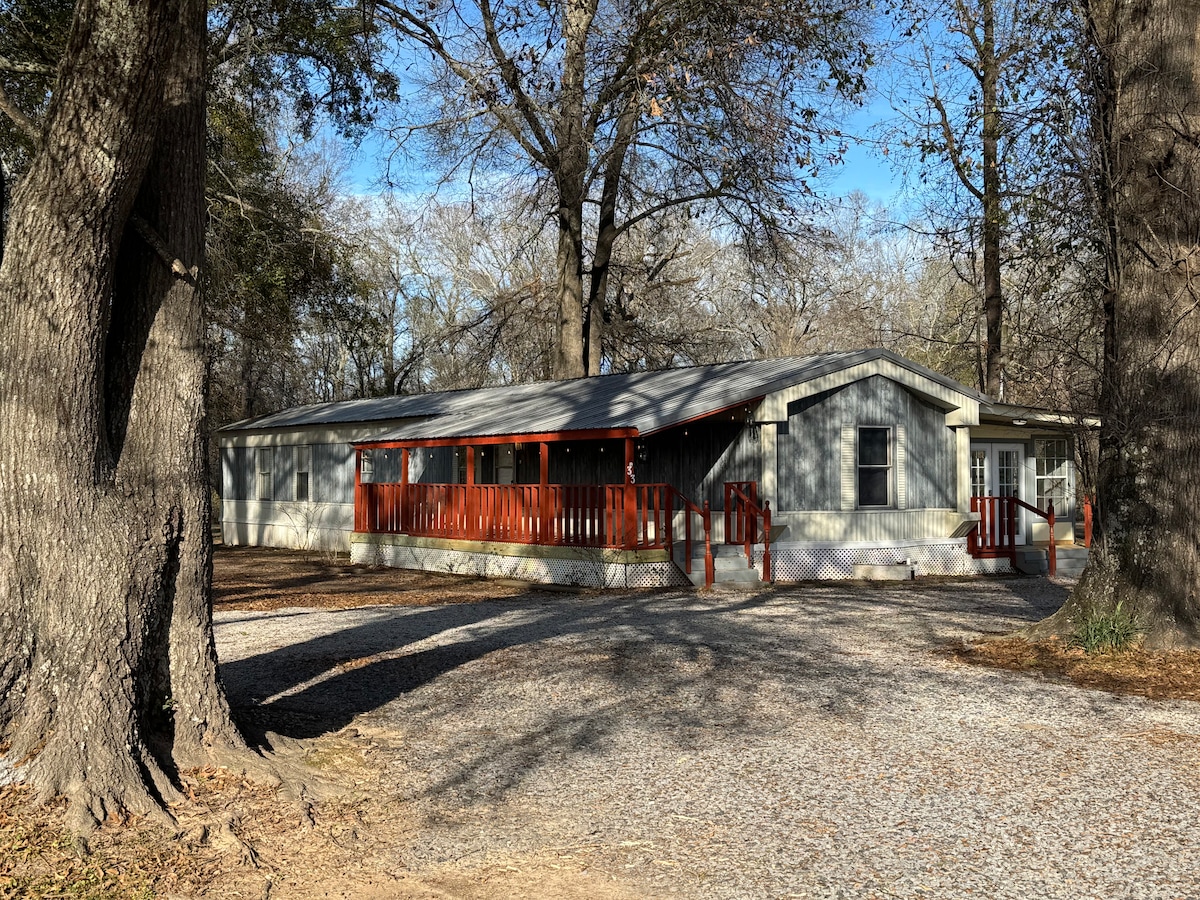 Maison préfabriquée confortable et étincelante de 3 chambres et 1 salle de bain sur le lac Caney. Comprend l'utilisation du quai pour la pêche et la détente (pas de baignade), un hangar à bateau et une rampe de mise à l'eau en béton. La maison est située sur la propriété derrière la maison principale avec vue partielle sur le lac de chaque côté du porche. À 5 minutes par eau de la zone de baignade/plage du parc d'État Jimmy Davis. Profitez des plus beaux couchers de soleil, des sports nautiques, assis près de l'eau autour du foyer, et d'une excellente pêche tout en vous relaxant dans cette escapade à la campagne.