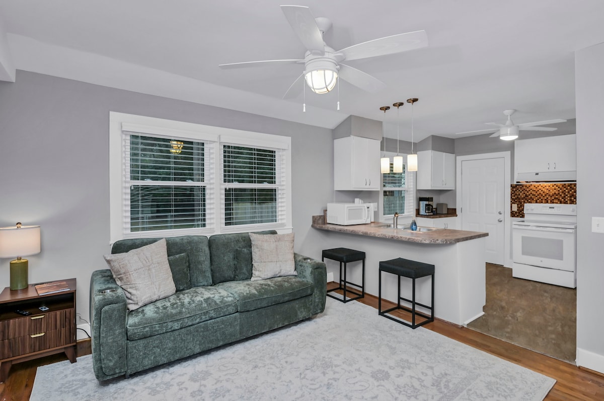 Un espace calme et élégant, rempli de lumière du soleil - le Studio est un appartement indépendant au 2e étage, niché au cœur de Forest Acres... Le secret le mieux gardé de Caroline du Sud ! Faites une promenade relaxante dans notre beau vieux quartier et trouvez de délicieux restaurants, épiceries, boutiques de desserts et cafés locaux. À quelques minutes de la vie nocturne culturelle/musicale de Columbia, de l'USC, du Koger Center for the Arts, de Fort Jackson, de Main St. et de The Vista ! (Limite d'âge : vous devez avoir au moins 23 ans pour réserver).