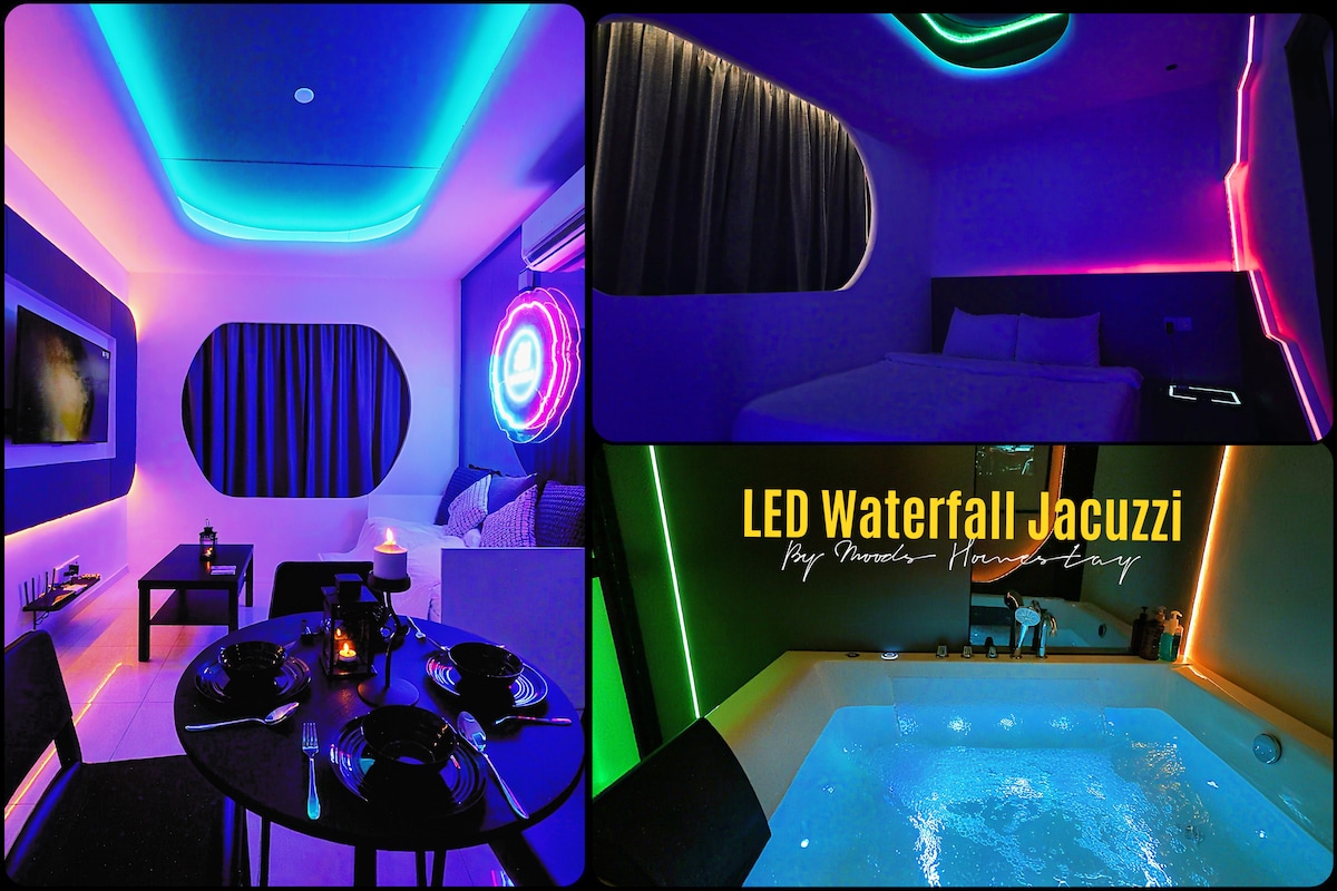 Private Luxury Suite | Walk to KSL Mall • Walking distance to KSL Mall • Cyberpunk-inspired futuristic design • Private Jacuzzi for relaxation • Immersive cinema experience with surround sound • King-size bed with 12-inch premium mattress • Pull-out sofa bed Boldly designed with neon accents and futuristic details, this suite blends comfort with a striking cyberpunk atmosphere. Perfect for couples, small business teams, or small families and memorable stay in the heart of Johor Bahru.
