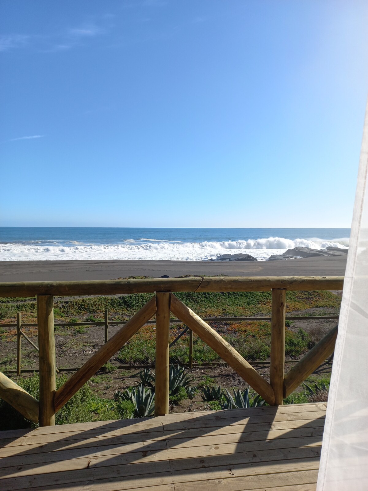 cabane équipée pour 4 personnes, bain à remous, belle vue, située en première ligne de la plage avec accès direct à la mer. Idéal pour une escapade romantique et tranquille dans le secteur de Papirua (à 25 km de Constitución). plage très étendue et peu fréquentée