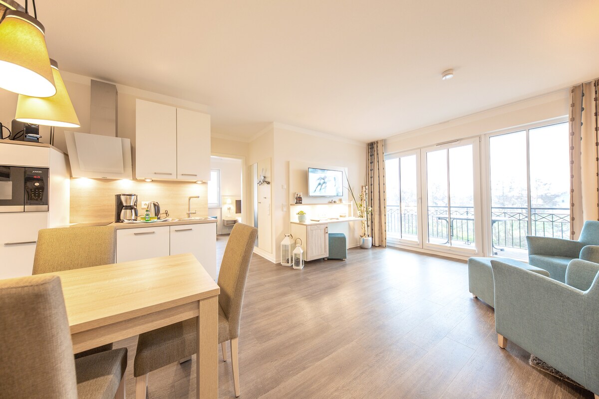 L'appartement non-fumeur de deux pièces 2-50, spacieux et baigné de lumière, d'une superficie de 58 m², peut accueillir jusqu'à 4 personnes. Il dispose d'une cuisine entièrement équipée, de deux téléviseurs, d'un canapé avec fonction de couchage (1,60x2,00), d'un bureau, d'un grand lit boxspring (1,80x2,00), d'un coffre-fort et d'une grande salle de bain avec douche à effet pluie. Profitez du grand balcon ensoleillé orienté plein sud, accessible depuis les deux chambres, avec vue latérale sur la mer Baltique et sur le parc bien entretenu situé à côté de l'hôtel.