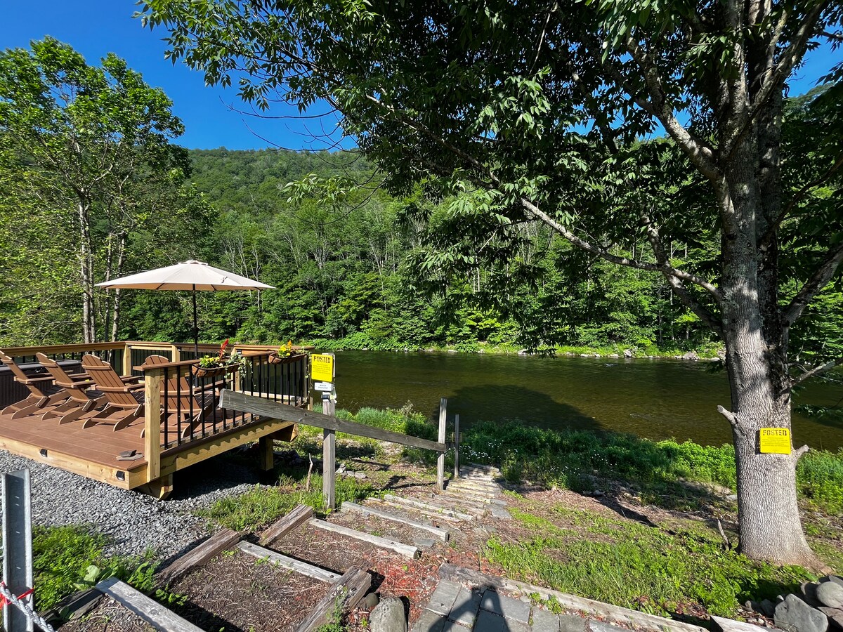 Situé à Trout Town USA ! Maison en rondins isolée de 1600 pieds carrés, 3 chambres, 2,5 salles de bain sur 5 acres privés. Magnifique vue sur la montagne Catskill toute l'année. La rivière Beaver Kill est à 5 minutes de là ! Superbe cheminée intérieure, porche avant relaxant et grande terrasse arrière avec barbecue au gaz. Internet et télévision par satellite dans les chambres, avec Netflix et HBO. Extérieur spacieux, avec belvédère, hamac, table de pique-nique et jacuzzi ! À moins de 2 heures du GWB, c'est une excellente escapade toute l'année !