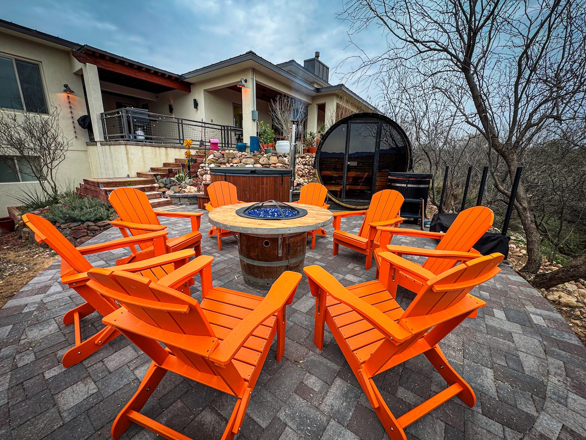 Récemment rénové pour une romance dans la région viticole. Réveillez-vous aux levers de soleil de la montagne à travers des fenêtres panoramiques, passez des journées de récolte à Page Springs Cellars (5 min), puis plongez dans votre bain à remous privé en cèdre en comptant les étoiles. Les anciens invités adorent l'accès direct au jacuzzi de la salle de bain principale, la vue paisible sur la montagne où les cerfs paissent à l'aube et la proximité des fêtes de récolte d'octobre. Les séjours au cœur de la nature se réservent rapidement, en seulement 3 semaines !
