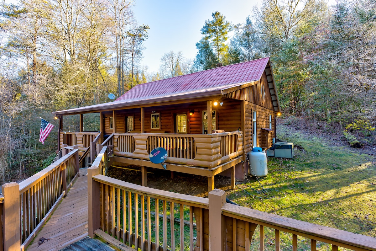 Chalet de montagne privé accueillant dans un cadre boisé avec 2 chambres queen et rideaux occultants. Profitez du concept ouvert avec une cuisine équipée, un canapé et une chaise inclinables et une cheminée à bois. Profitez du porche spacieux privé avec bain à remous, hamacs, chaises à bascule et salle à manger extérieure. Allumez le barbecue à gaz pour un barbecue ou détendez-vous autour du foyer sous les étoiles. Dans un cadre vraiment champêtre, attendez-vous à des chiens qui aboient, des insectes qui bourdonnent et beaucoup de charme rustique. Animaux de compagnie acceptés aussi !