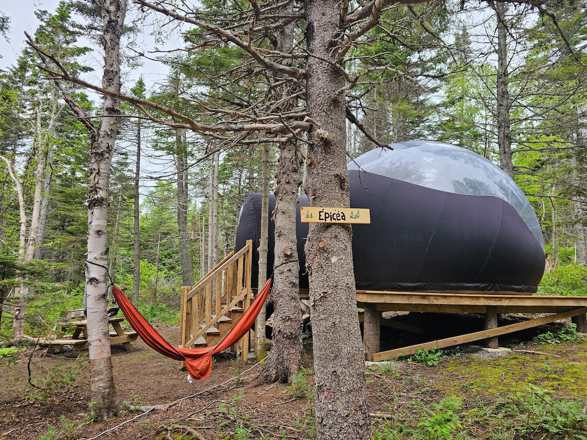 Offre toi un séjour unique de glamping en Gaspésie! À travers la paroi transparente tu pourras, confortablement allongé dans ton lit observer le ciel étoilé et la nature qui t’entoure. Une portion de la bulle est fabriquée avec un tissu opaque pour assurer ton intimité. Il y a également un sas qui permet de garder tes effets personnels à l’abri des intempéries et qui joue un rôle de chambre de pressurisation pour garder ta bulle bien gonflée.