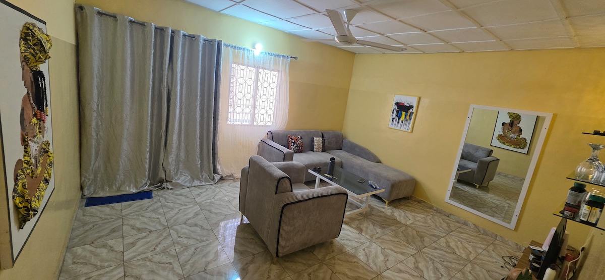 Appartement sur une villa R+1 avec un grand espace carrelé,garage,salle de bain ,cuisine avec vue sur la ville,dispositif de sécurité, assistance de séjour,moyens de déplacement disponible.Un lieu calme, agréable pour un séjour de rêve à 90 km de Cotonou la capitale économique du Bénin et à 5 km d'Abomey la capitale historique du Bénin.