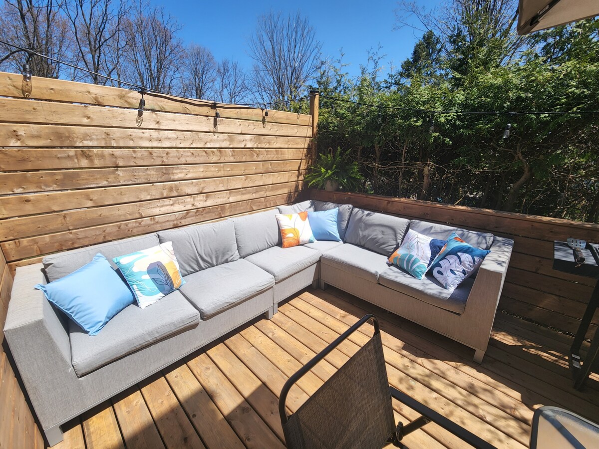 VEUILLEZ LIRE ! Mt. St. Louis et Horseshoe Valley à votre porte ! Il s'agit d'une SUITE INVITÉ lumineuse, grande et privée (appartement au sous-sol). Jacuzzi, patio, brasero et sentier isolé dans les bois pour profiter de la nature. La cuisine est équipée d'une plaque à induction et de tout le nécessaire, même un ouvre-bouteille :) Séjour/cuisine/salle à manger ouverts avec TV et Roku. La chambre est une œuvre d'art : sombre, mystérieuse et romantique ! Lit Queen Size personnalisé en bois de grange patiné récupéré sur notre propriété.