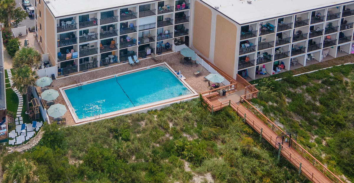 À seulement 50 marches de l'océan, avec la piscine entre les deux ! L'unité 202 de Beacher 's Lodge Condos offre une vue imprenable sur l'océan et donne sur une piscine olympique chauffée. Cet appartement moderne d'une chambre et d'une salle de bain, avec un lit king size et un canapé-lit, offre une vue fantastique depuis le salon, la cuisine et le balcon privé. Il est idéalement situé à proximité de la plage, de la piscine en bord de mer et des commodités locales, y compris des restaurants et une supérette. Une connexion Wi-Fi dédiée gratuite est également disponible pendant votre séjour.