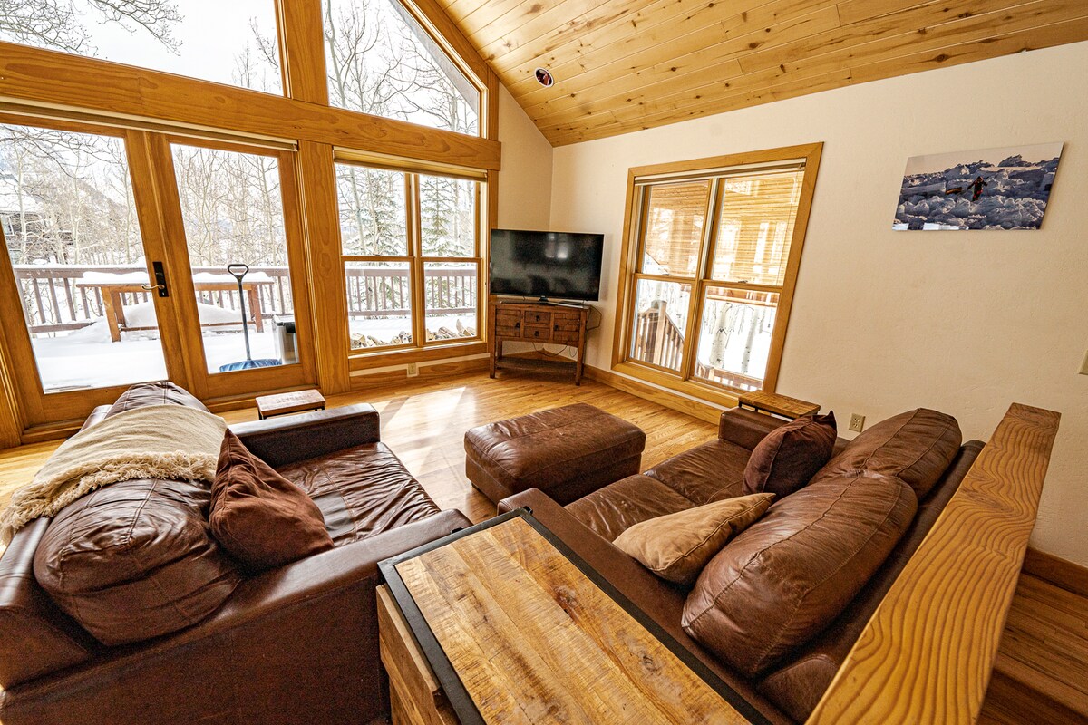 Ce logement d'angle de deux étages, deux chambres et deux salles de bain peut accueillir jusqu'à 6 personnes et ressemble plus à une maison qu'à une maison de ville ou à un condo. L'espace privé offre une belle vue orientée vers l'ouest sur la ville de Crested Butte en contrebas, Oh Be Joyful Range, Mount Emmons et Red Lady Bowl. D'immenses baies vitrées, une terrasse ensoleillée avec des chaises de ski Adirondack faites maison en été et en automne, une pelouse privée et un foyer au gaz confortable : l'endroit idéal pour l'après-ski avec les amis et la famille. Les couchers de soleil sont spectaculaires.