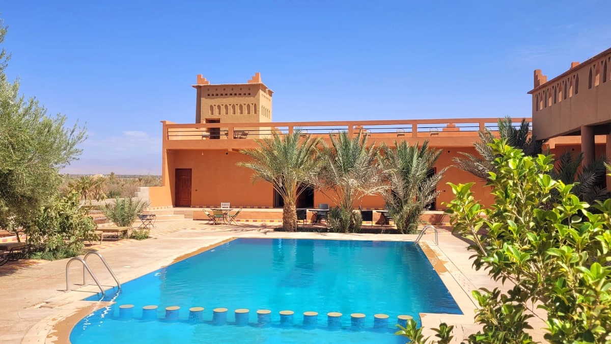 Villa familiale avec jardin arboré et piscines privative pour vous sentir "comme à la maison". Elle dispose d’un toit terrasse avec vue sur la palmeraie et l’Atlas, un petit joyau intimiste niché dans la palmeraie de Skoura. A 30 minutes de l’aéroport de Ouarzazate et proche de la vallée du Todra (vallée des roses), des gorges du Dadès et aux portes du désert. La villa comprend gardien, femme de ménage et chef cuisinier à disposition. Le petit déjeuner est compris dans le tarif.