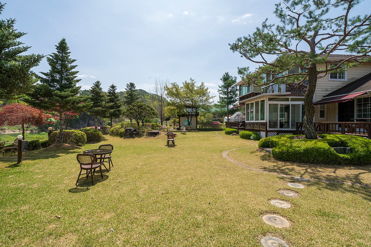 Les belles montagnes et rivières sont bonnes, et les vraies conversations et les rencontres avec les gens sont bonnes, alors j'ai niché cet endroit dans la vallée de la rivière sur les rives de la rivière Hongcheon. Venez à River Valley, où vous pourrez vous promener le long du bord de la rivière tout en sentant la verdure généreuse et aisée de la campagne et le parfum confortable de votre ville natale. Créez un magnifique souvenir d'une pension de conte de fées River Valley au bord d'une rivière calme et confortable