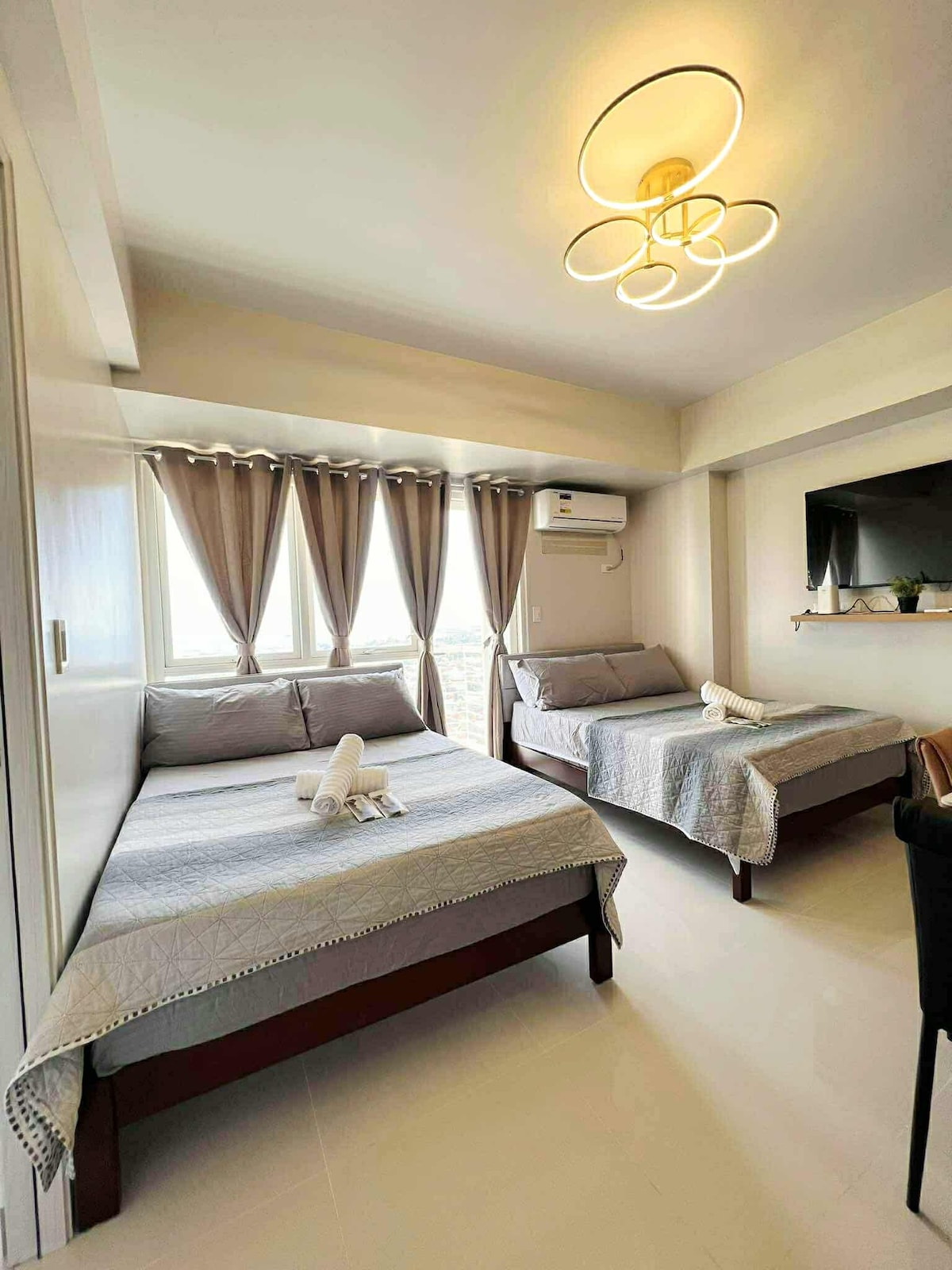 35sqm studio w/ balcony • 200Mbps Wi-Fi • King bed + 2 floor mattresses • Full kitchen + wood floors • Washing machine • Free hot & cold water • Gated condo w/ 24/7 security • 2 pools + playground • 7/11 & market right outside the entrance Nearby (by car): • Samal Ferry – 3 mins • Airport – 8 mins • Dusit Thani – 8 mins • Insular Hotel – 10 mins • Puregold – 7 mins • Azuela Cove – 12 mins • SM Lanang / SMX – 15 mins