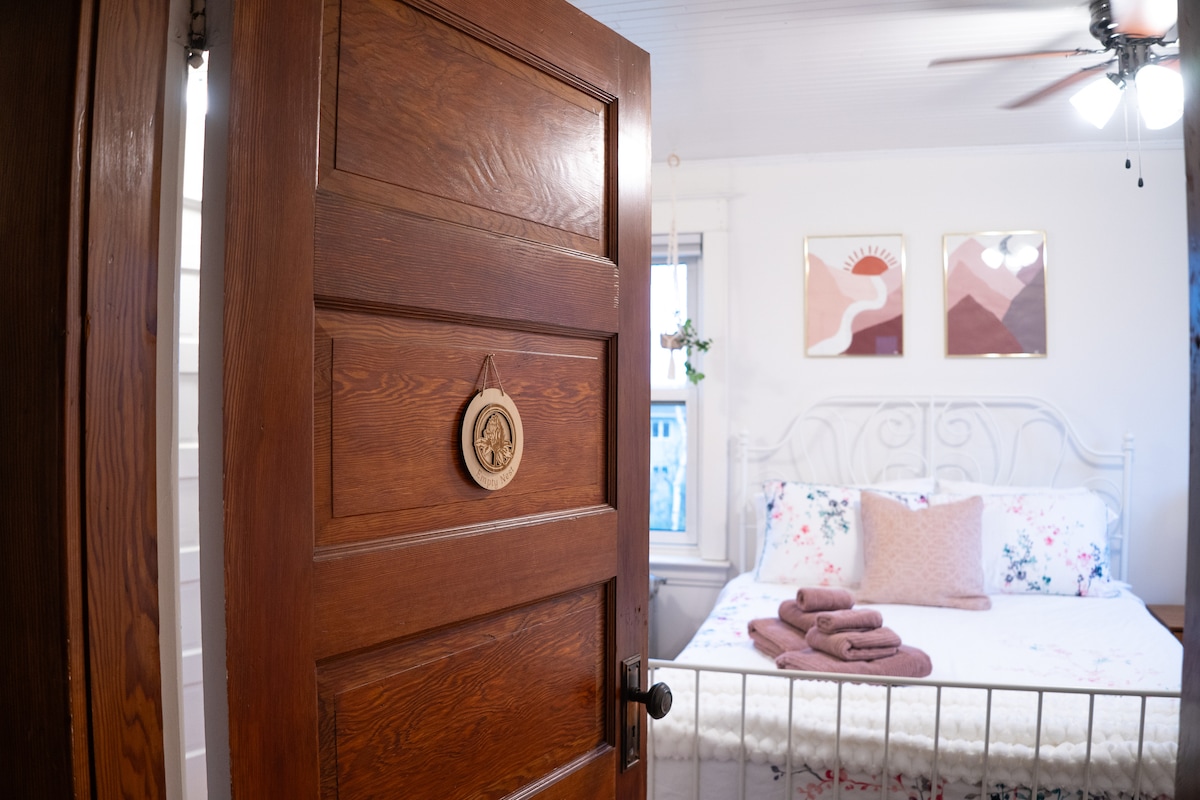 Vous ne voudrez pas quitter ce coin de paradis, entouré d'une belle oasis de verdure. Profitez de votre propre espace privé avec une salle de bain attenante, avec une passerelle vers un patio avec un foyer extérieur où vous pourrez profiter des soirées paisibles. Après une nuit de sommeil confortable dans un lit king size, commencez votre journée du bon pied avec un café chaud et l'atmosphère paisible de la petite ville. Un matelas gonflable pour les enfants séjournant chez les voyageurs est également disponible sur demande.