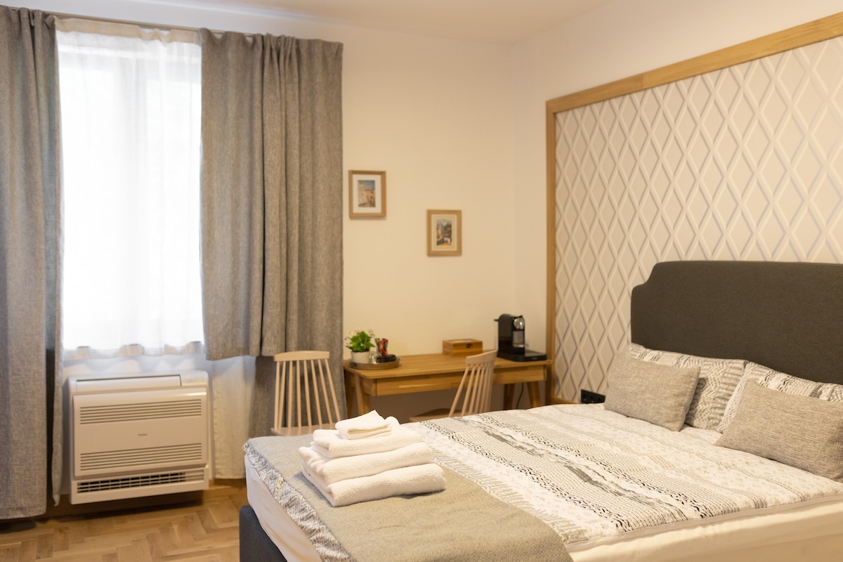 Bienvenue ! Nous avons créé cet appartement avec beaucoup de soin et un seul objectif : rendre votre séjour chez nous inoubliable et agréable. Il dispose des équipements nécessaires pour répondre à vos besoins, d'une cuisine entièrement équipée à une chambre confortable et une salle de bain moderne. Notre emplacement est central, à quelques minutes de la rue principale et de la vieille ville. Nous aimons vous offrir attention et confort.