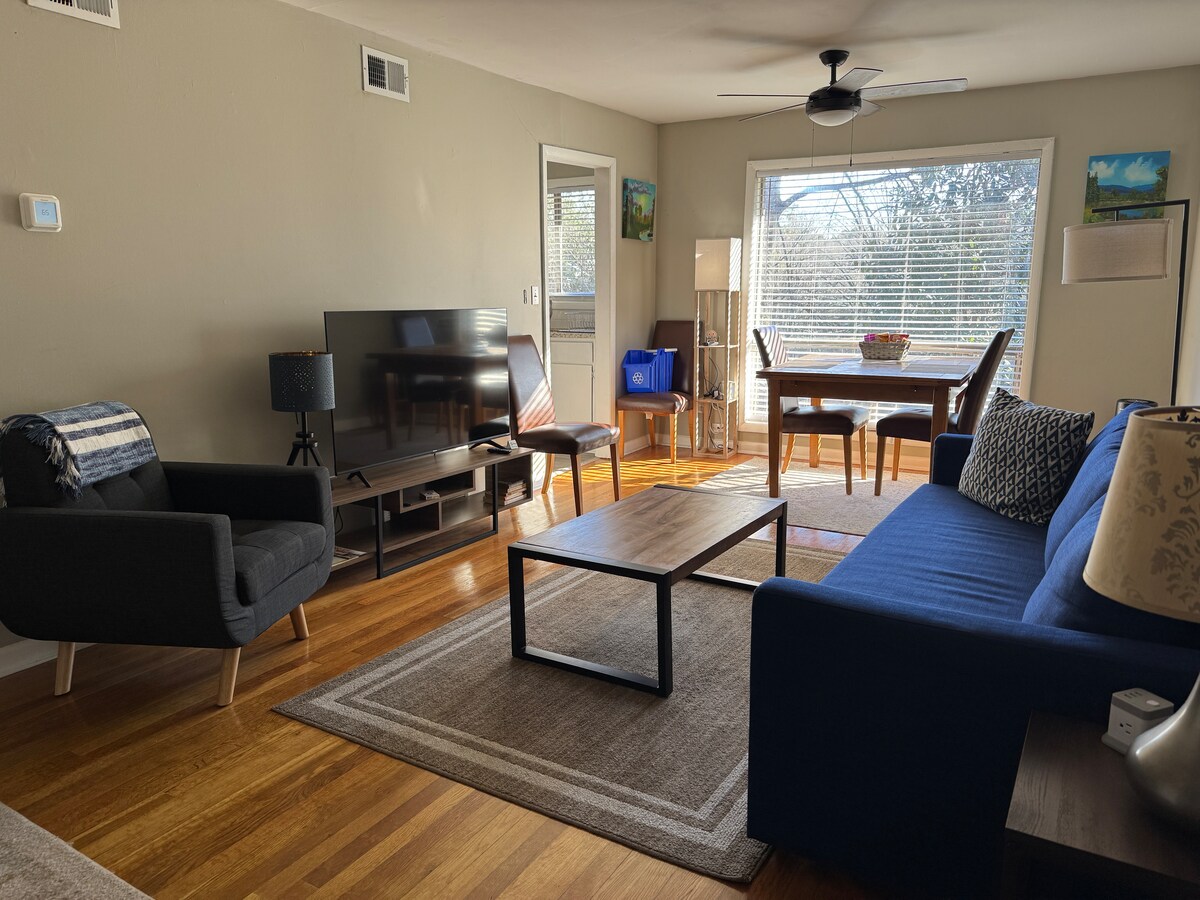 Profitez de notre confortable appartement de la maison de charrette niché au milieu des arbres et rempli de magnifique lumière naturelle. Cet appartement au 2e étage a été construit en 2021 avec des planchers en chêne foncé, des comptoirs en quartz brillant et un mélange de meubles modernes et vintage. Les œuvres d'art dans tout l'appartement ont été créées par des illustrateurs de livres d'images. Les appareils sont tous neufs, y compris un lave-vaisselle et un lave-linge/sèche-linge combiné. Un grand nombre de places de stationnement dans la rue est disponible et cette maison est située à seulement un demi-mille du centre-ville de Decatur.