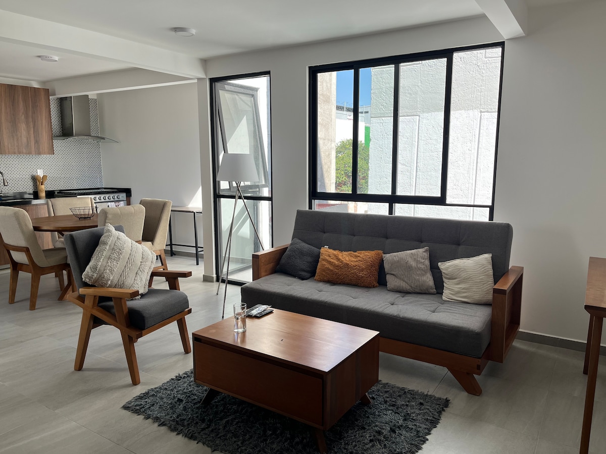 Moderno y confortable depto. tipo estudio con distribución funcional y estilo contemporáneo. Cuenta con recámara, baño completo y medio baño, cocina abierta equipada, estancia con sofá cama y escritorio ideal para home office. Ubicado en edificio reciente en zona céntrica y estratégica en Colonia del Valle Centro, rodeado de cafés, restaurantes y supermercados, con excelente conexión a las principales vías. Ambiente tranquilo, práctico y acogedor, ideal para viajes de trabajo, paseo o descanso.