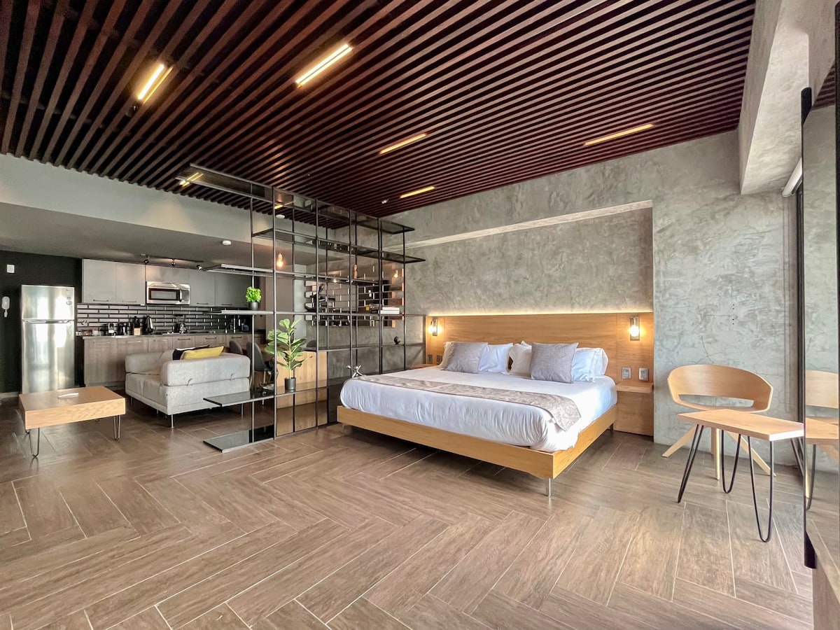 Profitez d'une expérience avec style et bon goût dans ce logement. Spécialement conçu pour profiter et se détendre. C'est un espace idéal pour les couples ou les voyages d'affaires. Il dispose d'un balcon avec une excellente vue panoramique, avec de la chance, vous pourrez apprécier d'excellents couchers de soleil. Nous avons des stores black out pour réguler l'entrée de la lumière. Une grande salle de bain et un dressing pour vous dorloter avec une douche. Et nous vous assurons que vous aurez toujours du café et du thé pour ces moments de paix.