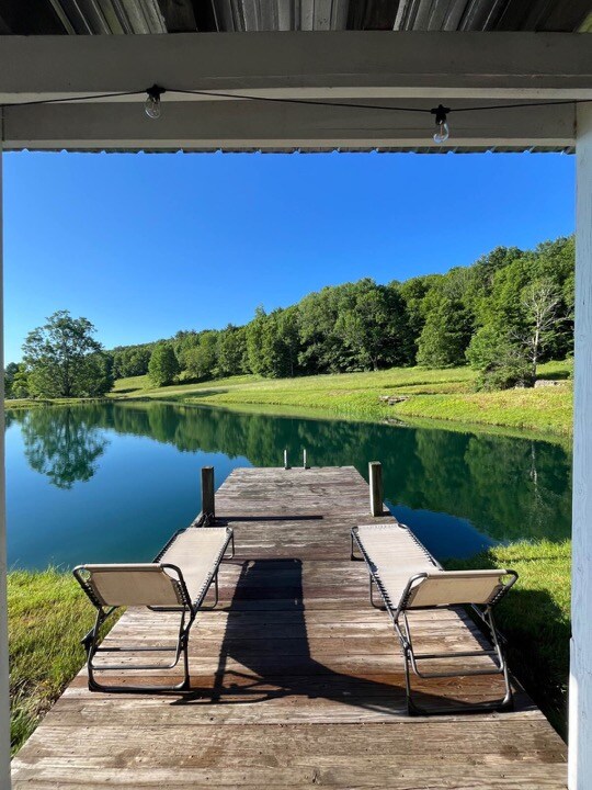 1200 sq. ft Post & Beam 2 story Barn Cabin set on 18+ acres of property w/1250 ft. of rd frontage leading to this gem. Amish wood furniture and a wood burning stove. Open loft concept on 2nd floor offers 1 king bed, a trundle bed with 2 twins (sleeps 4), 1/2 bath & closet space. Downstairs offers kitchen, dining room, living room and full bath. Private park on property w/hammock, volleyball & basketball court, swing set, slide & playhouse, yard games (in house & shed) barbecue & firepit.