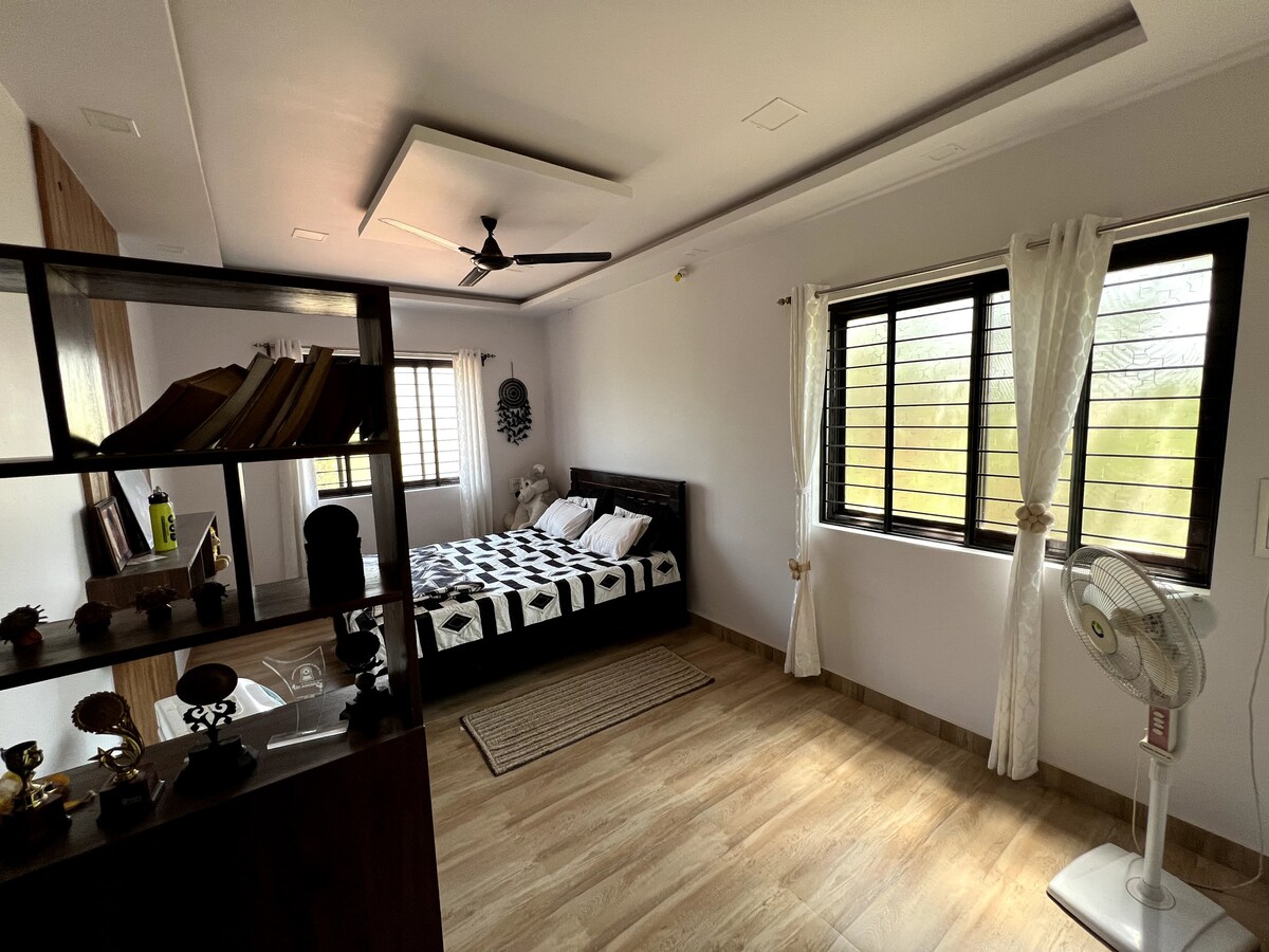 Bienvenue dans notre maison confortable et moderne 2BHK, parfaite pour les familles ou les groupes d'amis à la recherche d'un séjour confortable et relaxant. Cette maison spacieuse dispose de deux chambres confortables avec matelas Queen Size, un salon et une cuisine fonctionnelle, ce qui la rend idéale pour des vacances mémorables. Notre maison est équipée de tous les équipements dont vous avez besoin pour un séjour confortable, y compris une connexion Wi-Fi, une télévision avec Jio et OTT, une alimentation de secours de 16 heures, un refroidisseur d'air, une boîte à repasser, un lave-linge, un sèche-cheveux, etc.