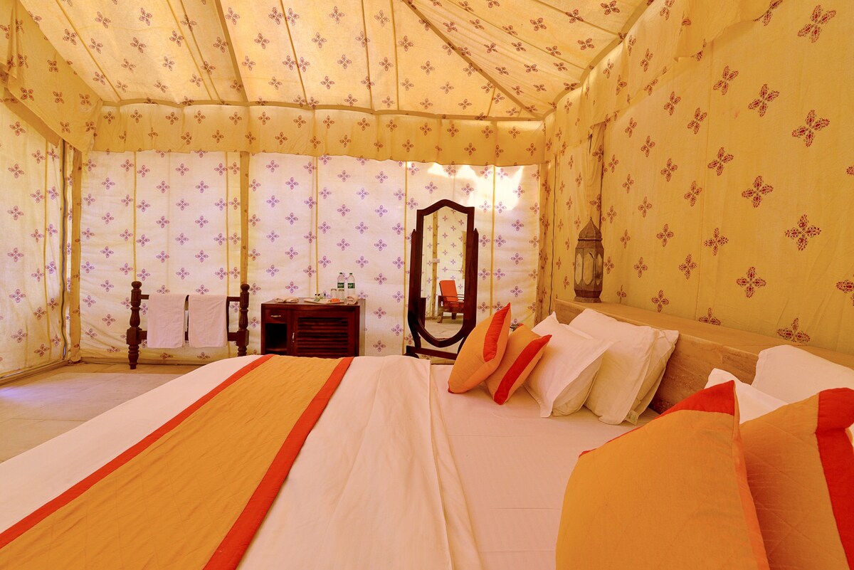 Enjoy the lovely setting of this romantic spot in nature with san Welcome to our luxurious desert camp nestled on the golden sands of Jaisalmer. This camp offers you a unique experience amidst the sand dunes. Here you can watch stars at night, enjoy folk music and see 40+ species of birds in the morning. Comfortable tents and delicious local food along with traditional Rajasthani hospitality will make your trip unforgettable. A perfect blend of both adventure and peace, this is our desert camp