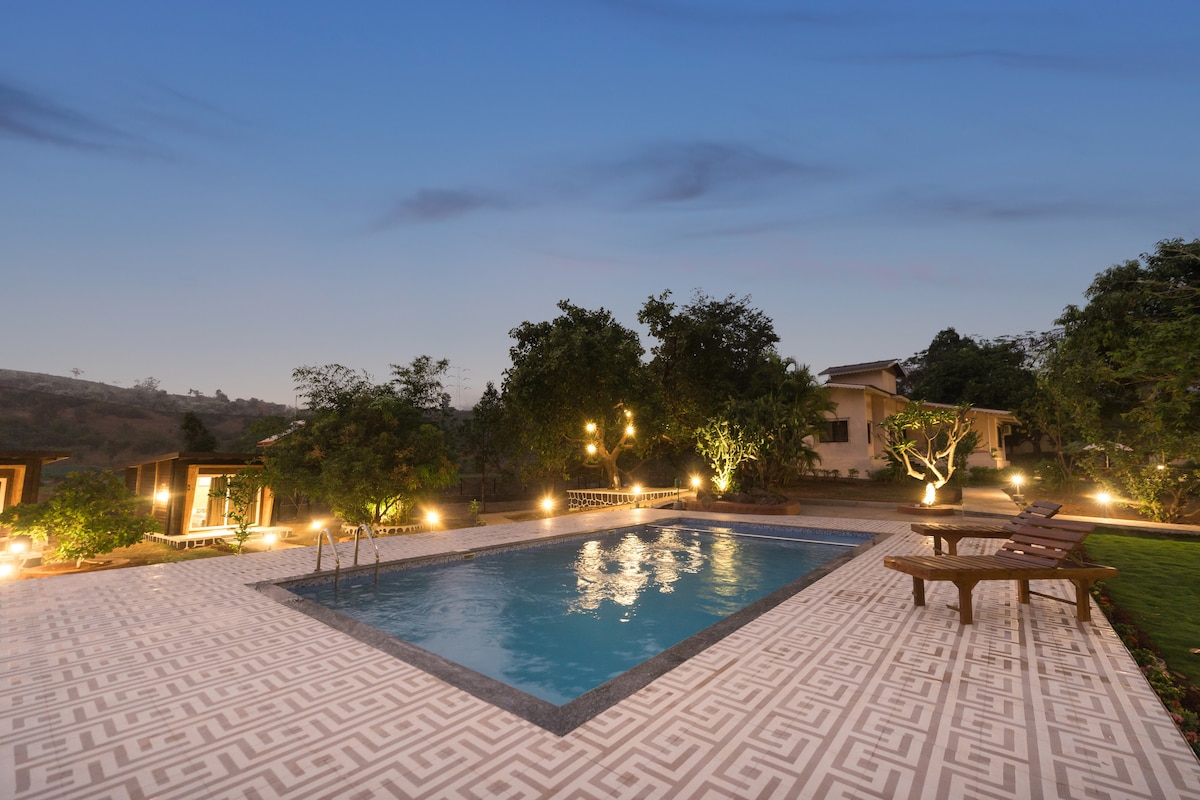Experience a serene retreat, a picturesque 3-BR 4-Bath farmhouse in Nasrapur, Karjat. This haven, adorned by lush greenery, features a pool, a flowing river & featured in Hotelier India. Crafted with love, the rustic design offers spacious, open areas, inviting a sense of freedom & communion with nature—an ideal escape for a city detox. It stands out for commitment to environmental sustainability. This villa can sleep 15 guests overnight & 30 guests for the day making it ideal for parties.