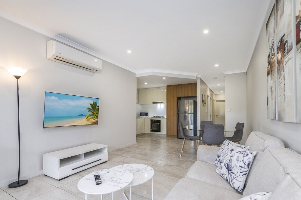 Modern building (completed May 2025) with 8 spacious 2-bedroom apartments in central Morley, walking distance to Galleria and Coventry Markets. Open-plan living, quality furnishings, ducted aircon, full kitchen, laundry, secure parking, fast Wi-Fi and wheelchair access. Sofa bed in lounge. No pets or parties. Bathroom is semi-ensuite (with hallway door); the opening between the master bedroom and bathroom has a curtain, not a door. Balcony design, glass type and views may vary.