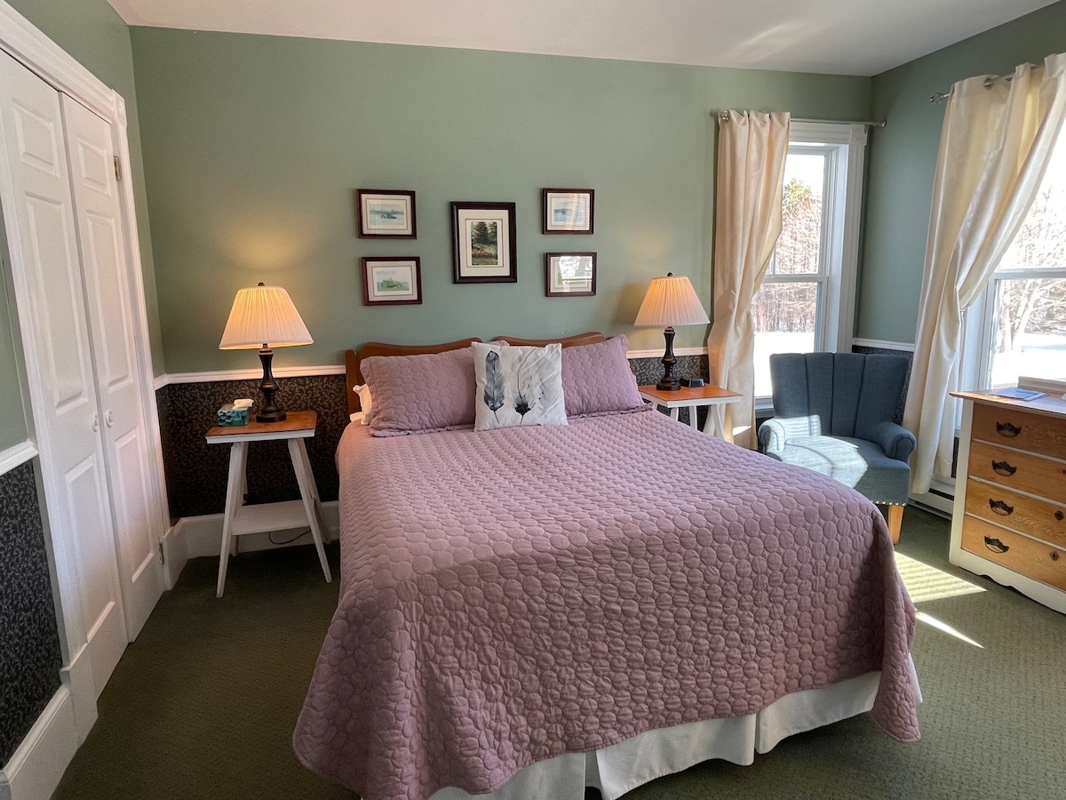 Nous offrons une chambre calme, paisible et très confortable avec votre propre salle de bain privée de l'autre côté du couloir. Un somptueux lit queen est luxueusement drapé avec des draps en coton de 480 tc et une couette en duvet. Nous offrons une sélection d'oreillers, de couvertures en laine et une énorme liste de commodités dans la chambre : serviettes épaisses, peignoirs et chaussons ; bouteilles d'eau chaude ; WiFi gratuit ; TV ; lecteur DVD (avec beaucoup de films) ; haut-parleur Bluetooth ; mini-réfrigérateur ; coffre-fort ; stérilisateur UV ; réveil/radio ; sèche-cheveux et eau en bouteille.