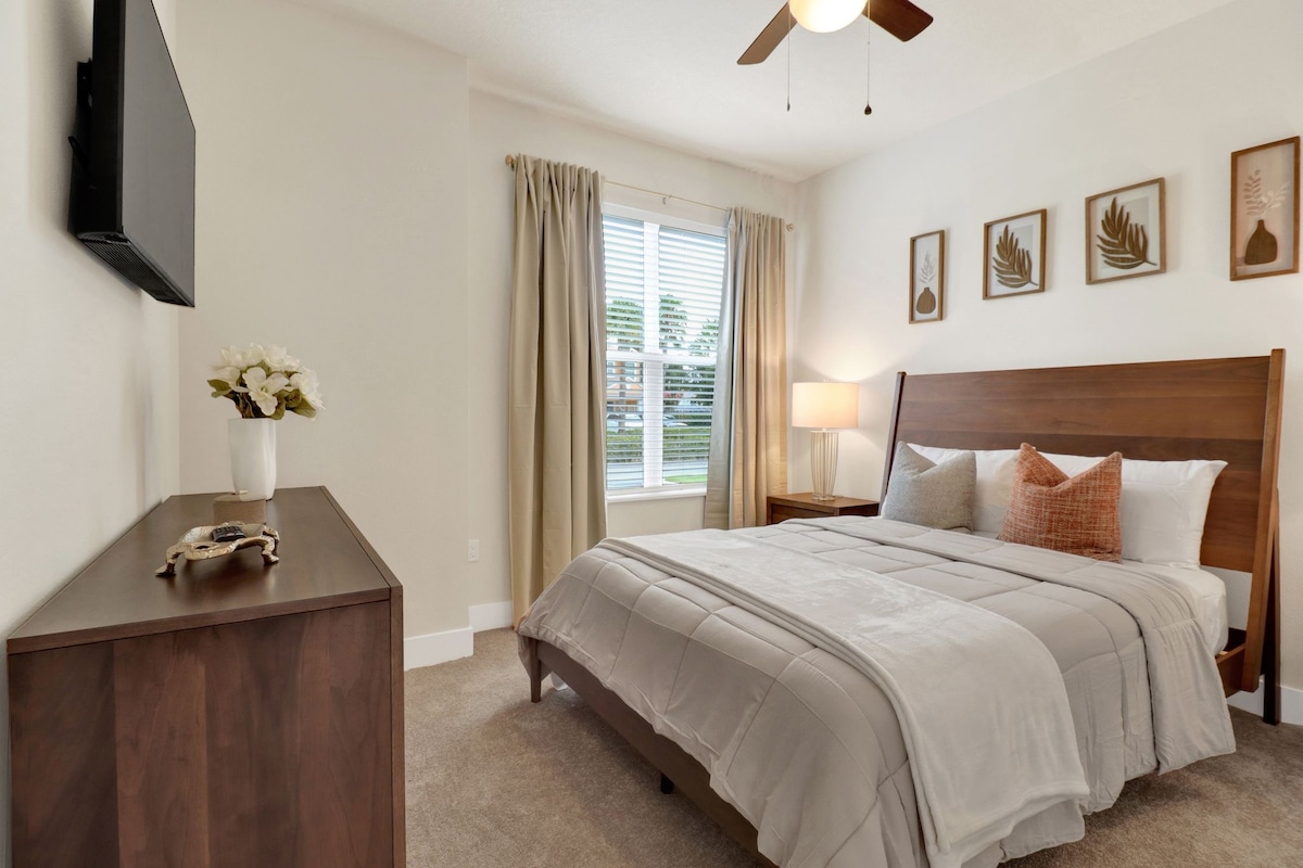 Bienvenue dans votre escapade sereine à quelques minutes des principales attractions d'Orlando. Cet espace soigneusement conçu présente des textures riches, des tons terreux et des touches modernes pour créer une ambiance chaleureuse et raffinée. Profitez des avantages du complexe hôtelier : plongez dans la piscine, faites de l'exercice à la salle de sport ou détendez-vous dans les hamacs sous le soleil de Floride. À quelques minutes à pied des commerces/restaurants/parcs à thème. Nettoyé professionnellement et entièrement approvisionné, il ne vous reste plus qu'à apporter votre valise. Réservez dès aujourd'hui pour découvrir le style de vie cinq étoiles.