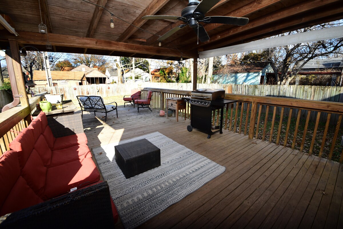 Détendez-vous dans ce logement calme et élégant. Cette maison de 2 chambres et 1 salle de bain est parfaitement située au cœur du centre-ville de Tulsa dans un quartier calme qui offre de l'intimité à nos voyageurs. L'espace dispose d'une grande cour arrière et d'une cour avant clôturées et d'une allée privée pour un grand espace de stationnement. L'emplacement est parfait pour que les visiteurs puissent profiter de tout ce que le centre-ville a à offrir. À distance de marche des principales attractions. Cox Center 0,6 miles Centre BOK 0,7 miles Théâtre Tulsa à 1 mile Cain's Ballroom à 1,2 miles