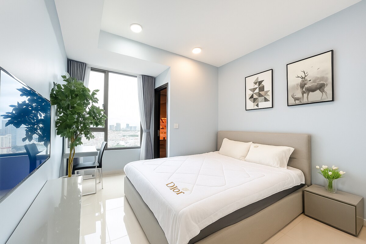 Gâtez-vous dans le luxe en explorant l'incroyable SG !Tout cet appartement de 1 chambre sera votre retraite de la ville toujours animée de Hô Chi Minh-Ville,mon appartement se trouve bien au-dessus de l'agitation de la ville. Vous pourrez vous détendre près de la piscine à débordement sur le toit ou vous entraîner dans la salle de sport bien équipée. Les deux sont gratuits ! Sortez, et vous serez au centre de tout :restaurants, cafés, cuisine de rue, mart et vie nocturne. Les attractions touristiques du district 1 sont à seulement 3 minutes en voiture ou à quelques pas de l'autre côté de la rivière SG.