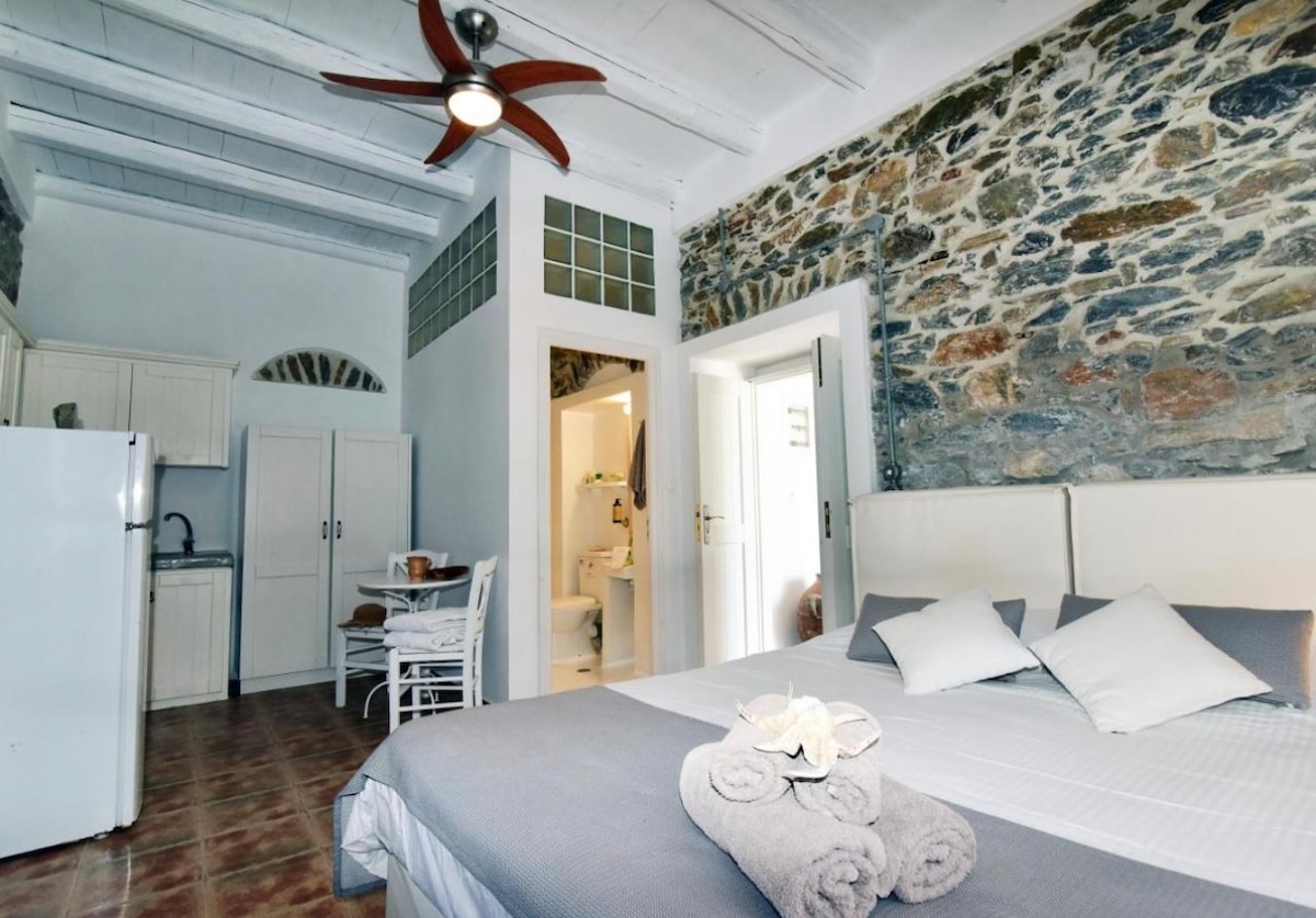 Appartements traditionnels exceptionnels sur une île grecque avec vue à 360° sur la mer au coucher du soleil, à 3 min à pied de la plage principale de l'île, à proximité des restaurants. Idéal pour les couples. Une chambre, cuisine intégrée entièrement équipée avec des équipements modernes. Il est souligné que l'appartement est complètement autonome (entrée séparée et balcon couvert, pas d'espaces et d'installations partagés). Il n'y a aucun risque d'infection au COVID et un nettoyage et une désinfection stricts sont effectués après le départ.