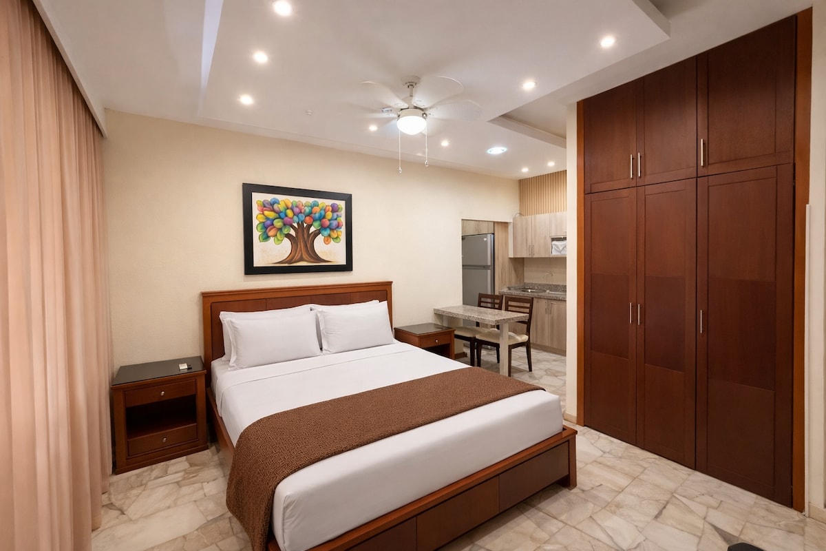 Suite confortable et bien équipée dans un quartier exclusif et sûr. Profitez d'un espace confortable avec télévision, climatisation, cuisine équipée et salle de bain privée avec eau chaude. La chambre dispose d'un lit de place et demie et d'une atmosphère idéale pour votre repos. De plus, vous aurez accès à une machine à laver, un sèche-linge et une belle piscine pour vous détendre pendant votre séjour.